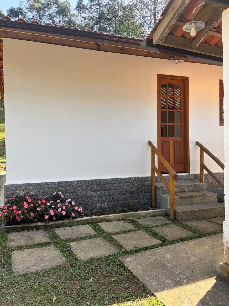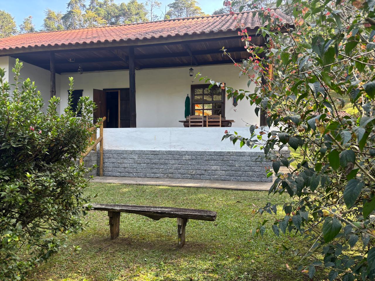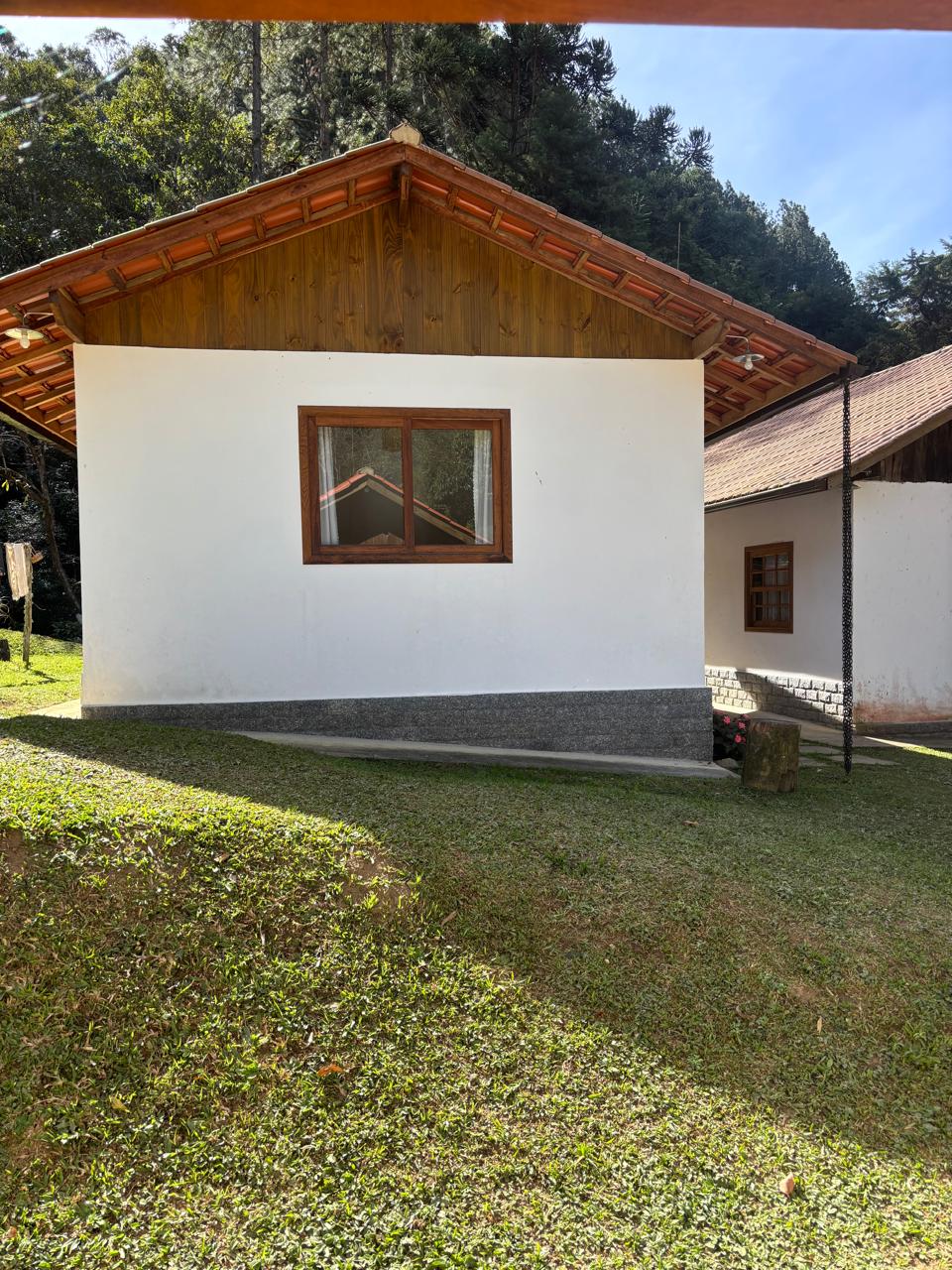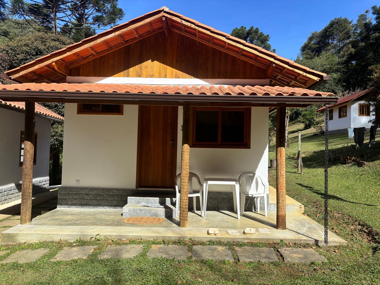 A casa principal, em dois pavimentos, conta com sala de estar, cozinha com forno a lenha, quarto e banheiro social, oferecendo um ambiente confortável e funcional.