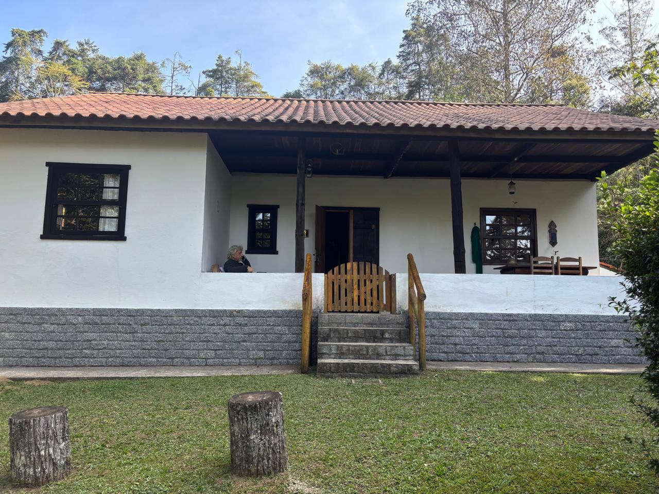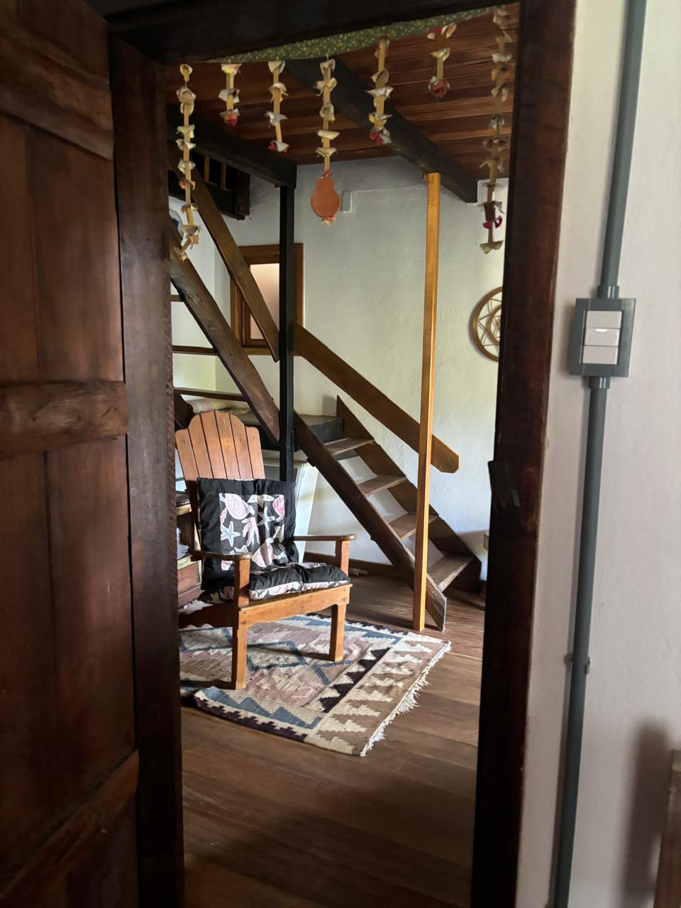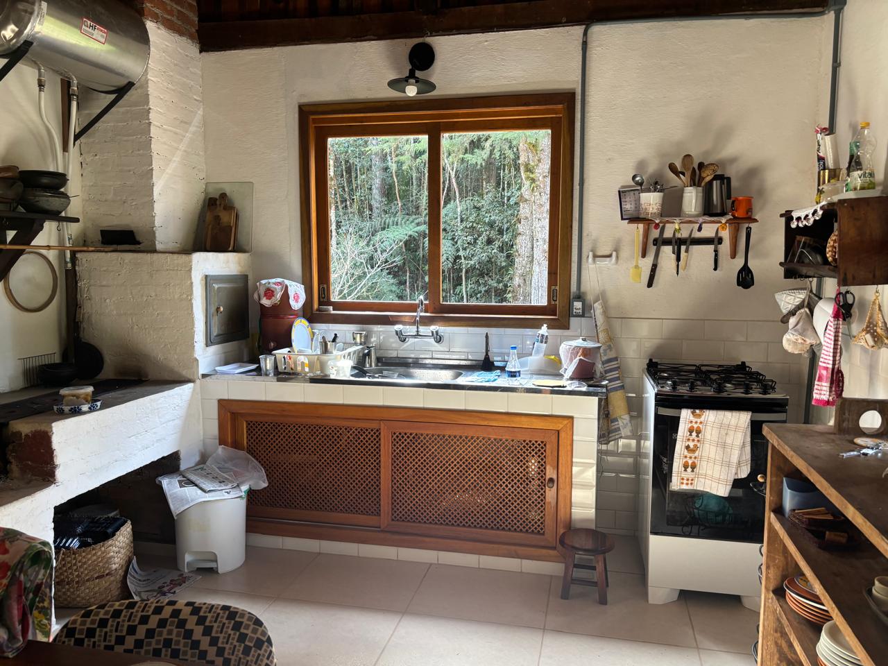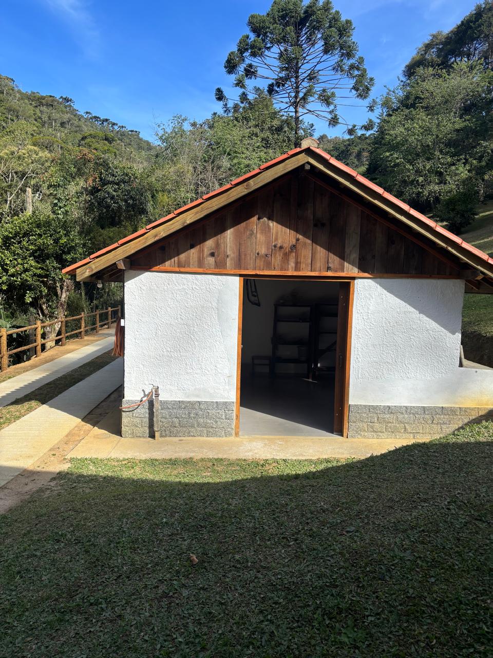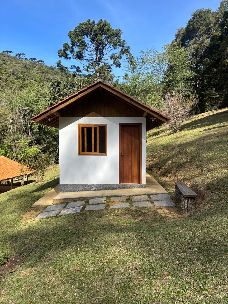 A casa principal, em dois pavimentos, conta com sala de estar, cozinha com forno a lenha, quarto e banheiro social, oferecendo um ambiente confortável e funcional.