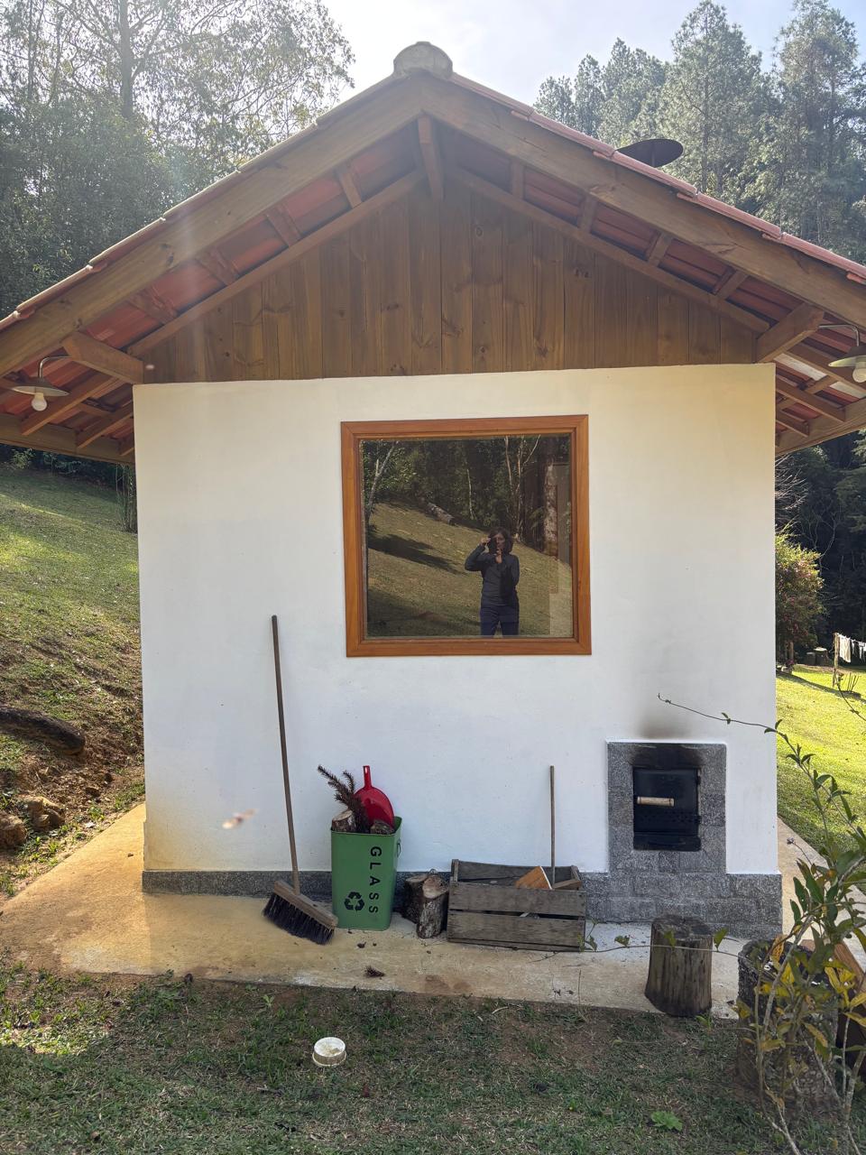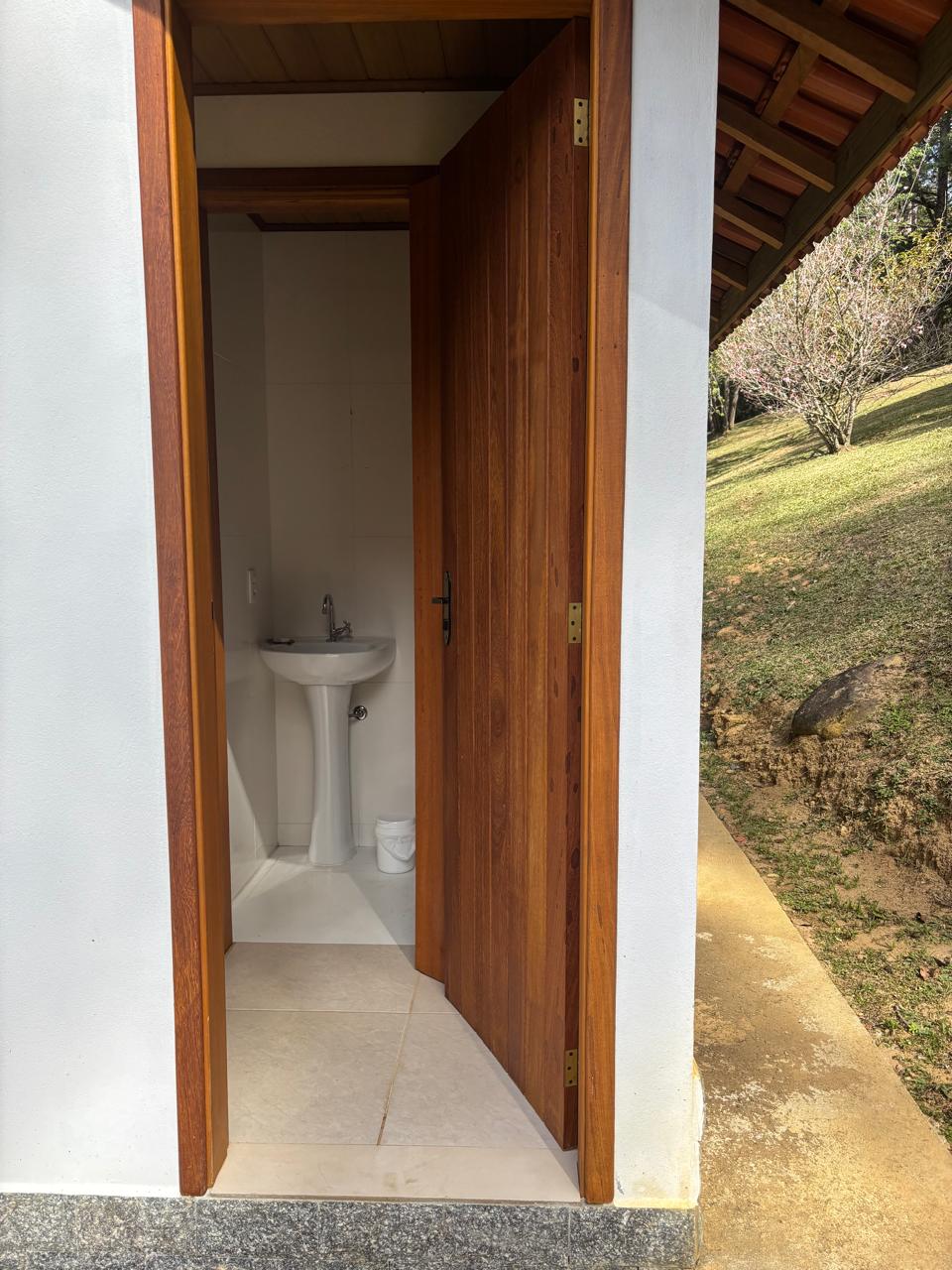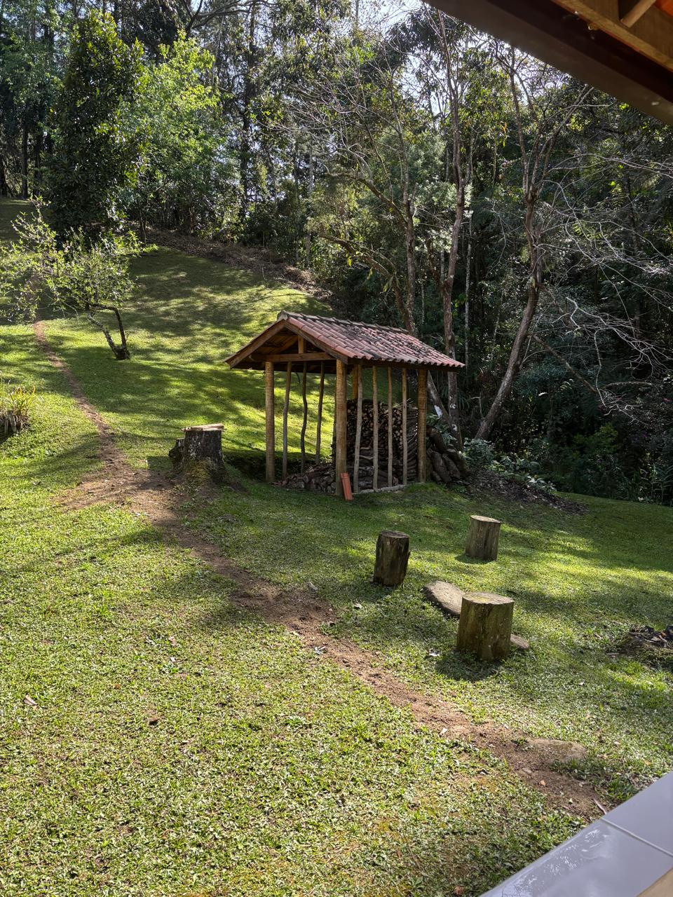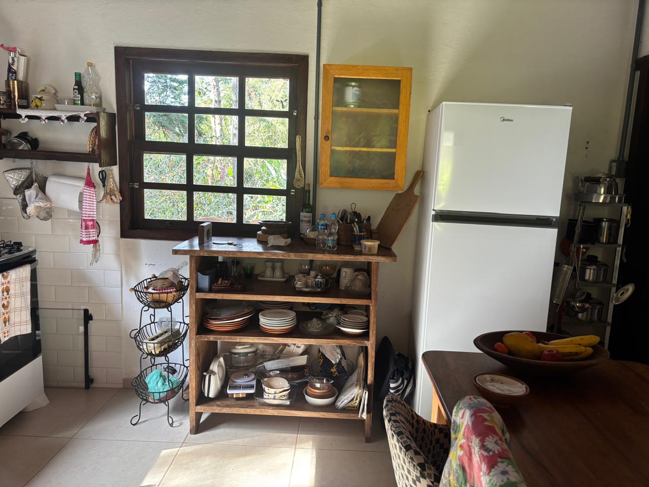 A casa principal, em dois pavimentos, conta com sala de estar, cozinha com forno a lenha, quarto e banheiro social, oferecendo um ambiente confortável e funcional.
